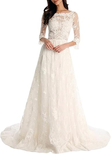 H S D Lace Wedding Dress 3 4 Sleeves Bohemian Long Bridal Gown