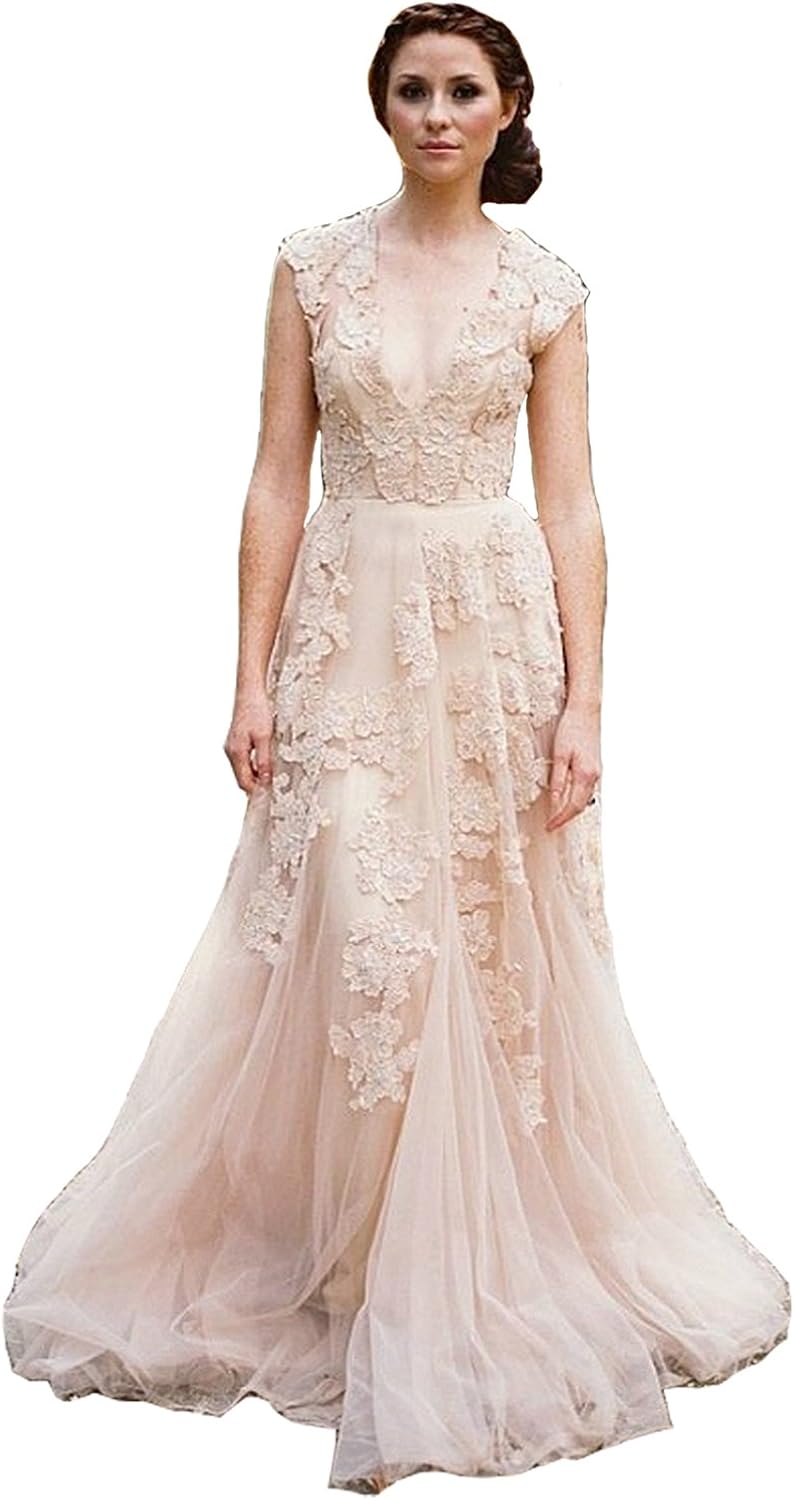 Ruisha Cap Sleeve Deep V Neck Lace Bridal Gowns Champagne Lace