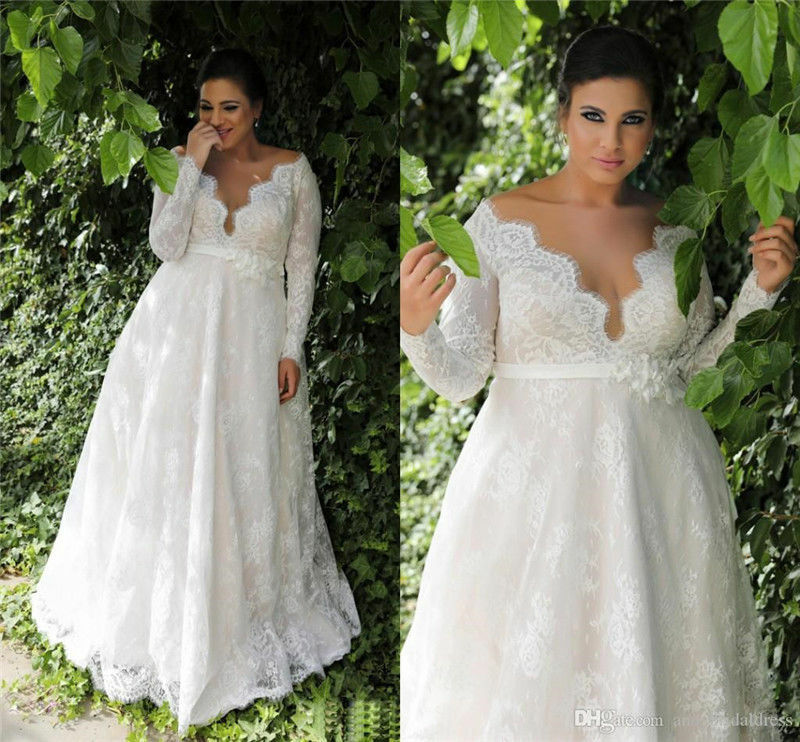 Plus Size Wedding Dress Long Sleeve V Neck A Line Empire Waist