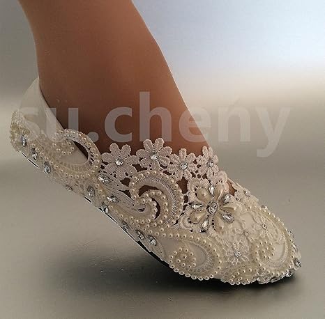 Stylish White Flat Wedding Shoe In Bridal E Bay Ivory Lace Pearl
