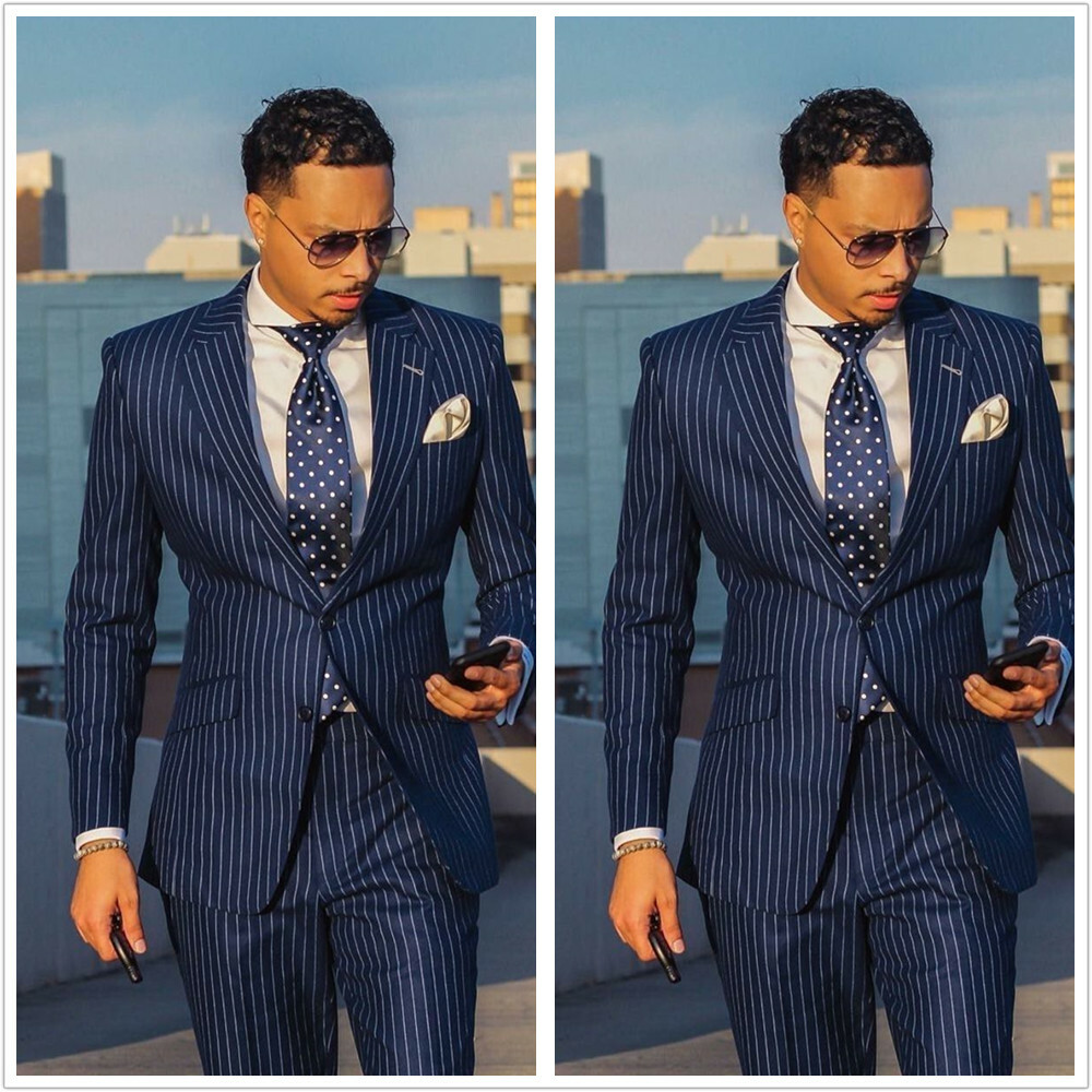 Striped Navy Blue Groom Men S Suit Tuxedos Business Party Wedding
